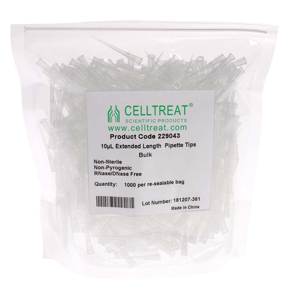 10µL Extended Length Pipette Tips, Bulk Packed, Non-sterile, Part number 229043-CT , Buy now from Celltreat at Laboratory Disposable Products. Reduce plastic waste by refilling empty racks (available separately) with bulk Pipette Tips