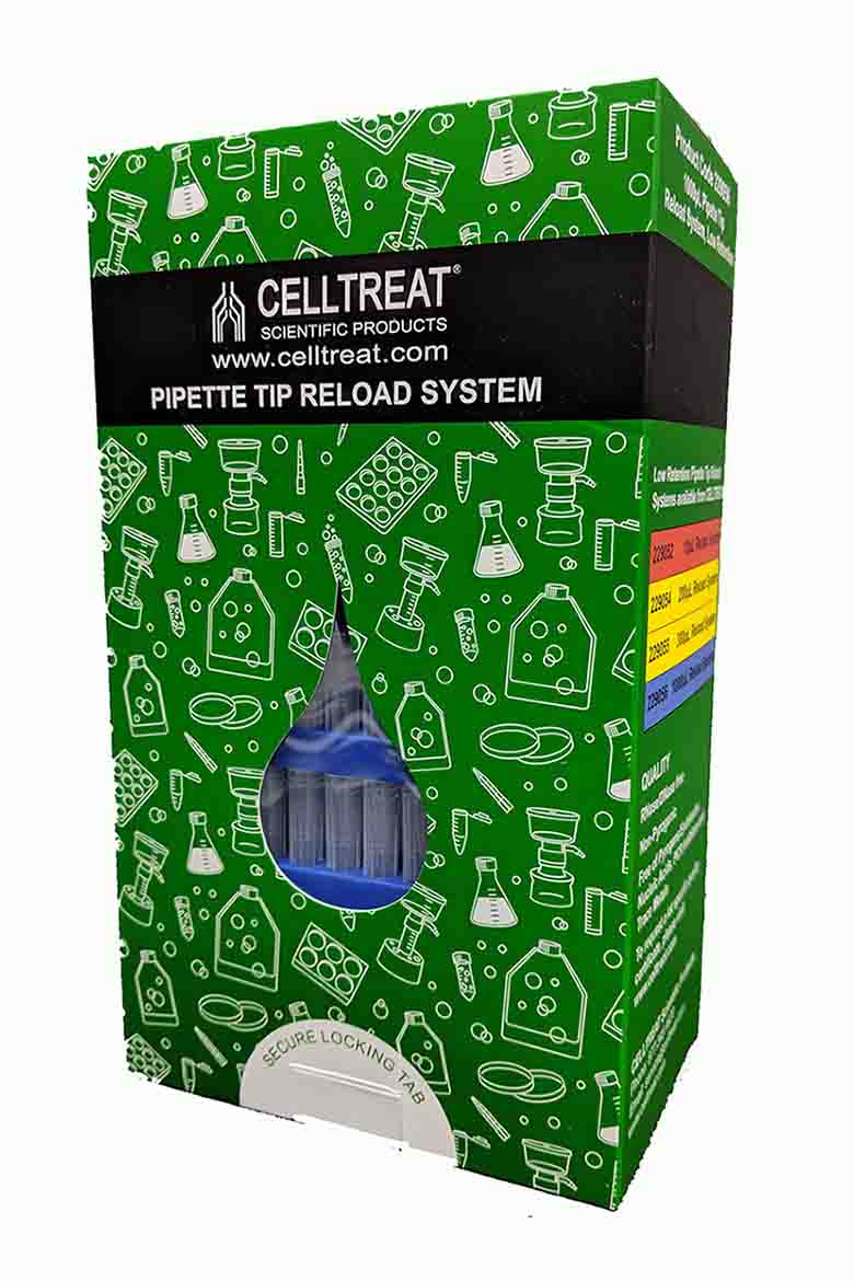 1000µL Low Retention Pipette Tip Reload System, Non-sterile, Part number 229056-CT , Buy now from Celltreat at Laboratory Disposable Products. Superior low retention option has smooth, hydrophobic surfaces to ensure accurate pipetting
