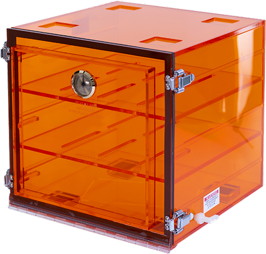 Amber Acrylic Desiccators, 12″ x 12″ x 12″ with 2 Perforated Shelves