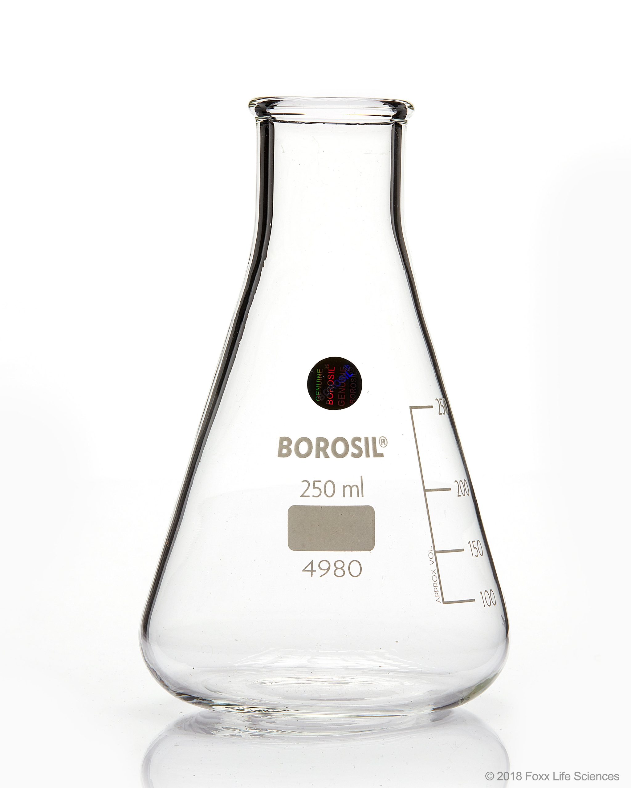 Flasks, Erlenmeyer, Narrow Mouth, Beaded Rim, 250mL , Part number 4980021-FL , Buy now from Borosil at Laboratory Disposable Products. Material: 3.3 Borosilicate Glass