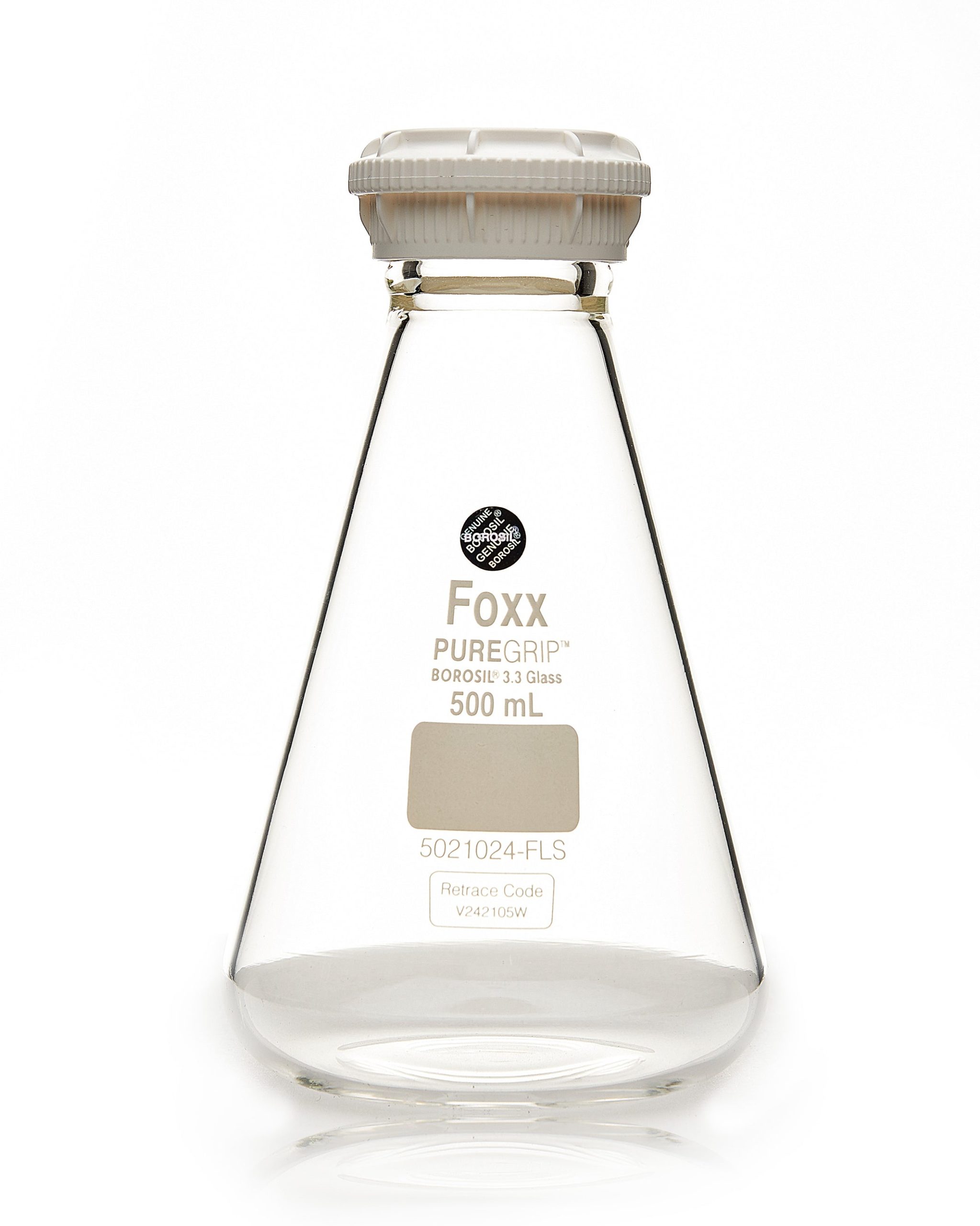 PUREGRIP® Glass Flasks, Erlenmeyer, Clr, GL45 VersaCap®, 500mL , Part number 5021024-FLS-FL , Buy now Fox Life Science at Laboratory Disposable Products. Perfect for single use applications and to phase out costly stainless steel apparatuses that are expensive to clean and validate.