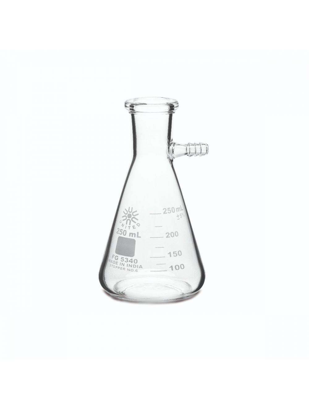 United Scientificâ„¢ FG5340-250 Filtering Flask, Borosilicate Glass, 250Ml , Part number FG5340-250-US , Buy now United at Laboratory Disposable Products. Cylinders comply with ASTM E1272, Class A, meets USP standards, individually serialized and certified. Double metric scale, calibrated to contain. Borosilicate glass cylinders with pour spouts feature heavy uniform wall tubing and strong, stable, hexagonal bases. All cylinders come with bumper guards.