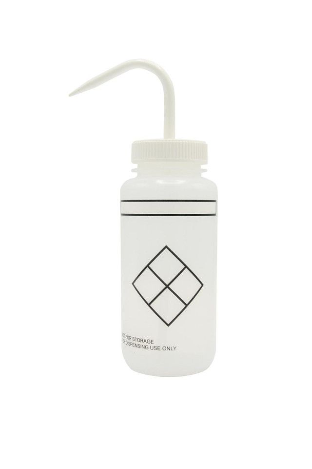 Wash Bottles Safety Labeled, Self Venting, Wide Mouth, 500mL, Self Labeling, Clear/Clear