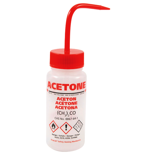 Washbottle GHS WM Acetone, LDPE 250mL, 5/CS, Part number 506485-0001-DY, Buy now from Dynalon at Laboratory Disposable Products. Multi-lingual wide mouth GHS wash bottles featuring the patented DripLok vapor venting valve that prevents solvent drips
